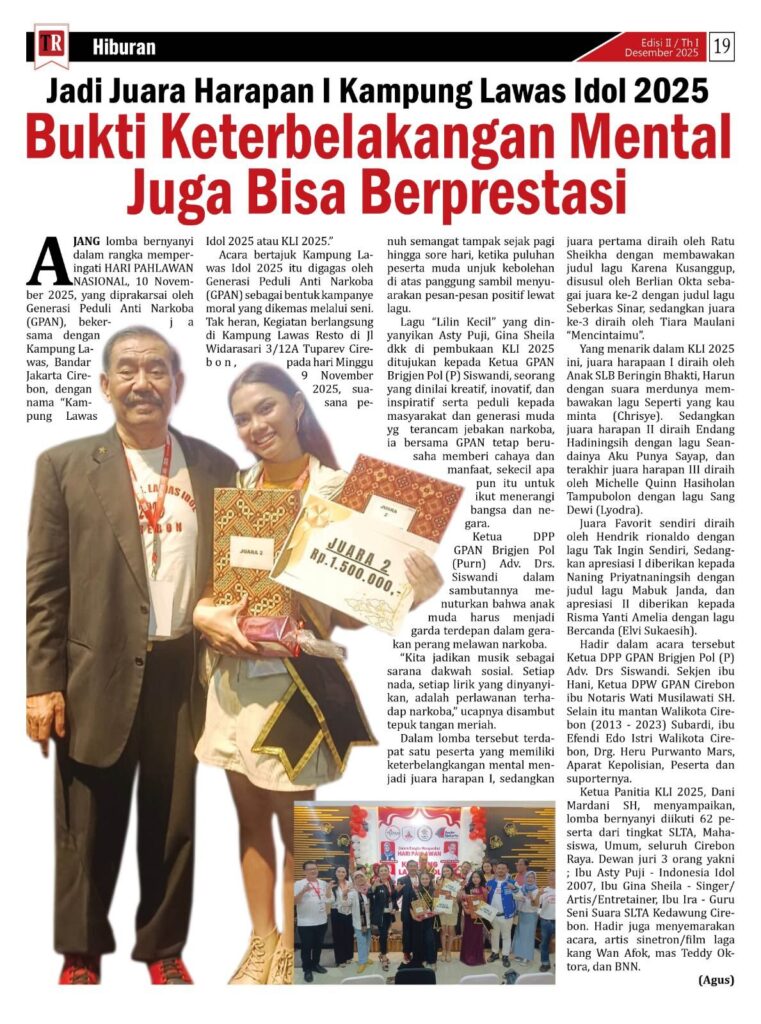 HiburanJadi Juara Harapan Kampung Lawas Idol 2025, Bukti Keterbelakangan Mental Juga Bisa Berprestasi Redaksi Berita2 bulan ago2 bulan ago01 min Navigasi pos Previous: Kehadiran Podcast Realita Menjadi Wadah Artis Legendaris Tanah AirNext: Penguatan P4GN, Narkoba Bukan Sekedar Persoalan Hukum, Tapi Kemanusiaan Tinggalkan Balasan Batalkan balasanAlamat email Anda tidak akan dipublikasikan. Ruas yang wajib ditandai *Komentar * Nama * Email * Situs Web Simpan nama, email, dan situs web saya pada peramban ini untuk komentar saya berikutnya.